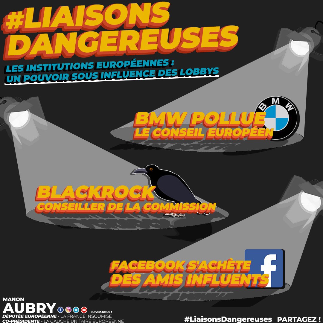 Pour tenter de percer la bulle et gâcher la fête des lobbyistes, je lance l’initiative #LiaisonsDangereuses. Sous cette étiquette, je publie un répertoire de tous les scandales éthiques auxquels j’assiste au sein des institutions. Forte de ce recueil de dérapages démocratiques qui s’épaissit de jour en jour, je poursuis en parallèle mon combat au Parlement pour que soient adoptées de nouvelles règles d’éthique et qu’une autorité indépendante soit mise en place pour les appliquer. Parmi les 45 affaires comptabilisées l’année passée, et que vous pouvez retrouver ici (➡️https://twitter.com/ManonAubryFr/status/1264817575629918209), voici quelques pépites :